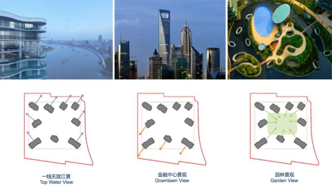 以此来保证所有居住单元均可同时欣赏两种以上主题景观,且每单元必有一个绝佳的主题景观,从而实现将不可复制的景观优势最大化。