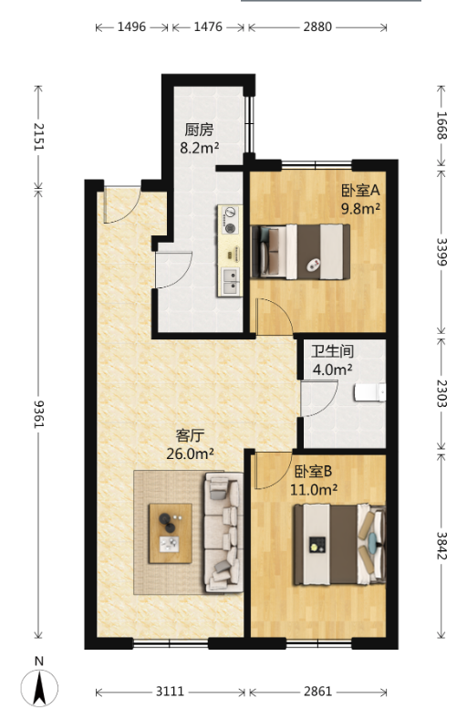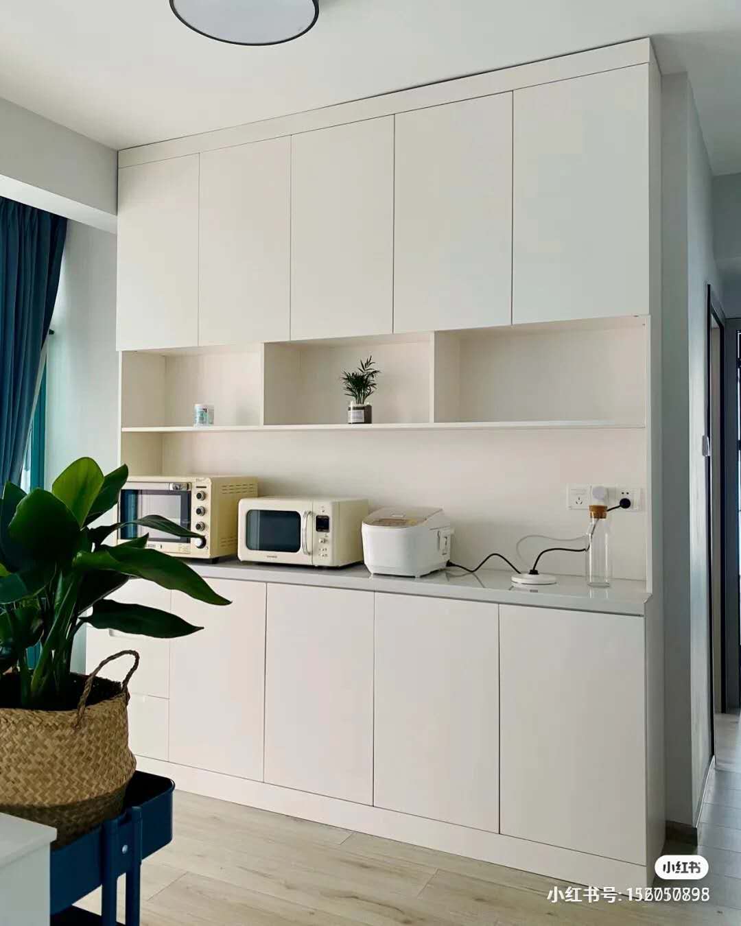厨房空间一般比较长,和次卧对齐,因此也增加了厨房的空间和整体收纳。