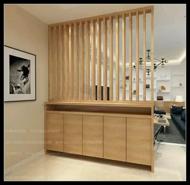 在玄关的处理上可以采用定制柜与屏风相结合的情况进行设计,并且在墙面的处理上可以采用镜子等反光材质进行处理,拉伸整体空间的宽度,增加进门视觉的通透性以及视觉的开阔性。
