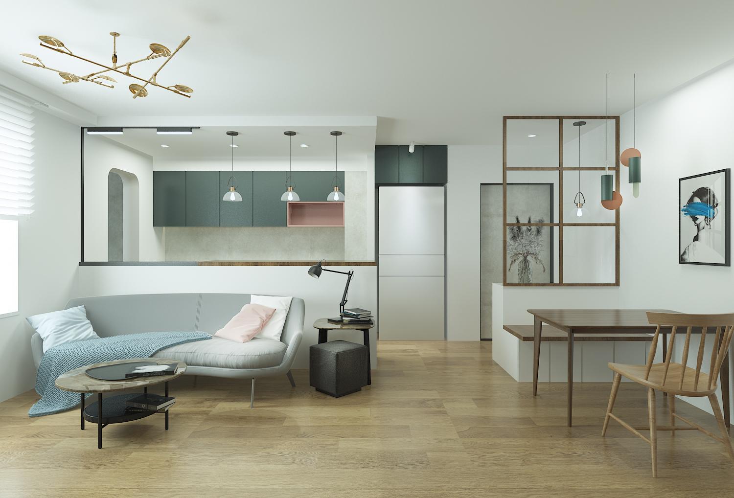 2.利用屏风后方空间进行就餐区的设计,既可以不影响视线,同时可以利用卡座增加整体的收纳和就餐区的最大化利用。