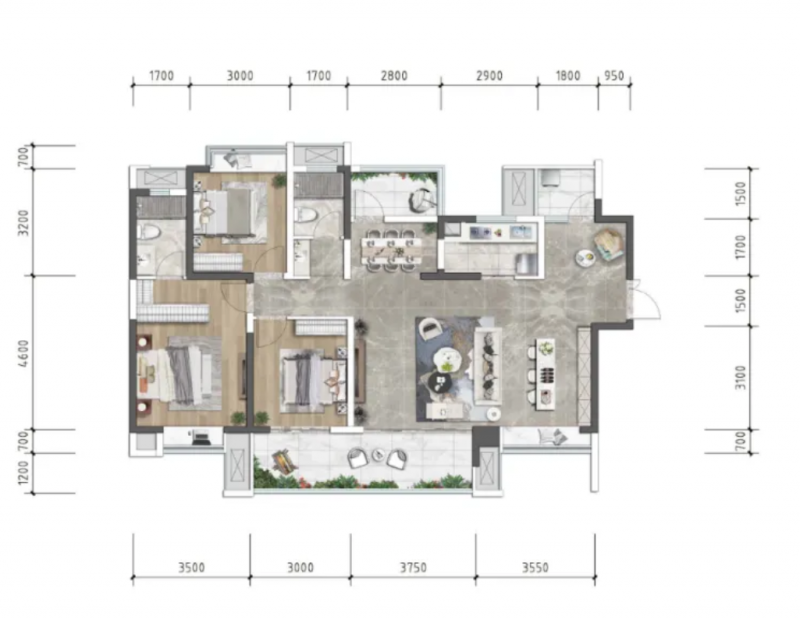 所有户型景观阳台面积都很大,可以有充足的采光和通风效果;整体说来,设计中规中矩,每一户配备生活阳台,也没发现暗厨暗卫。如果预算充足,还是建议优先朝南方向的中高楼层大户型。