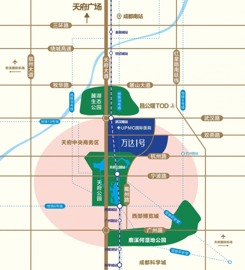 项目西侧紧邻在建的成都万达匹兹堡大学医学中心(UPMC)国际医院,床位设置500张,计划于2022年6月开业。