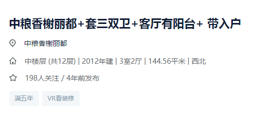 据贝壳找房网显示,中粮香榭丽都有一套房子已经挂牌将近4年都还未卖出去。