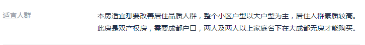“此房权属为双产权,购此房需要成都户籍家庭名下无房,看房时可多做了解。”