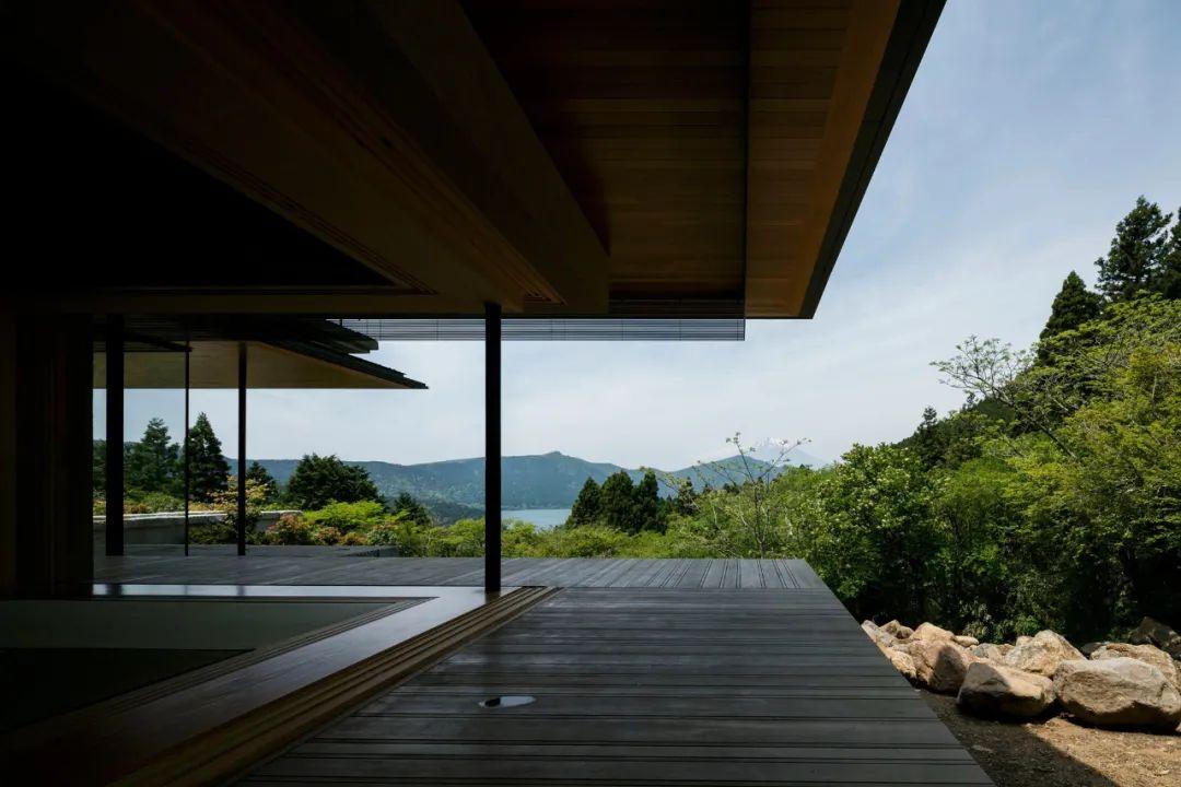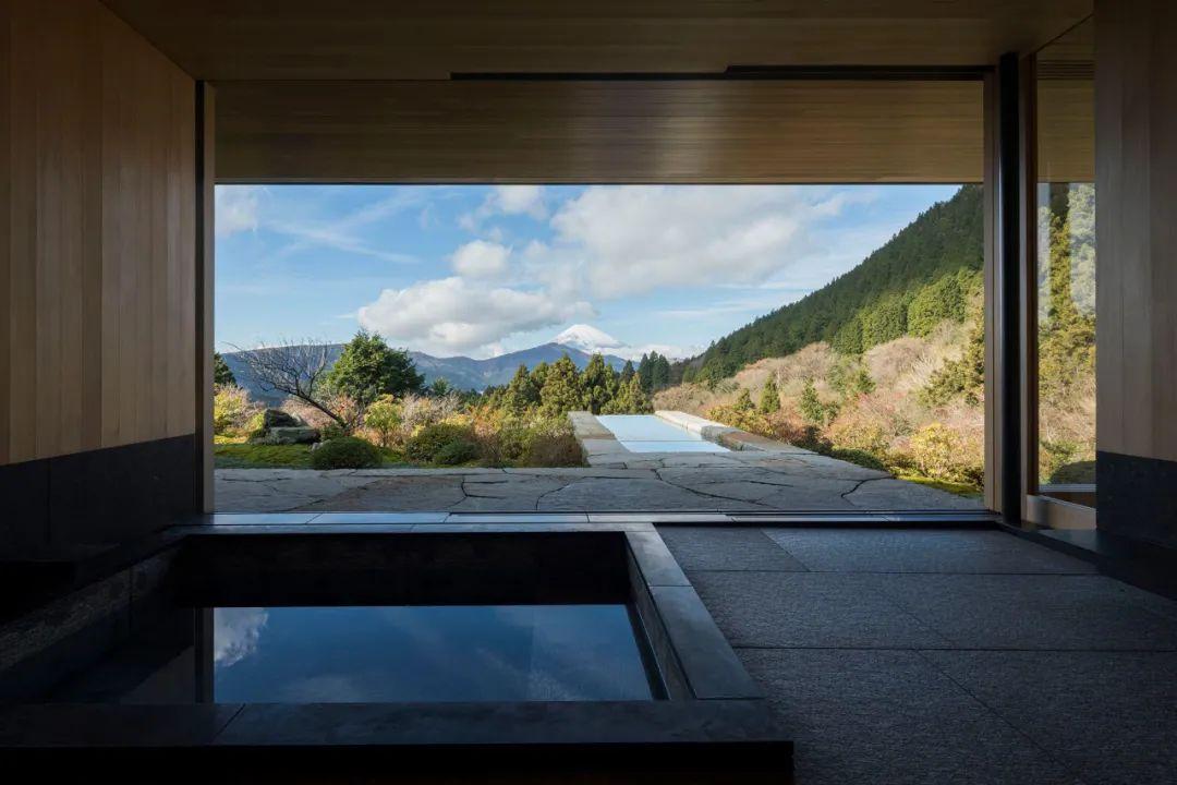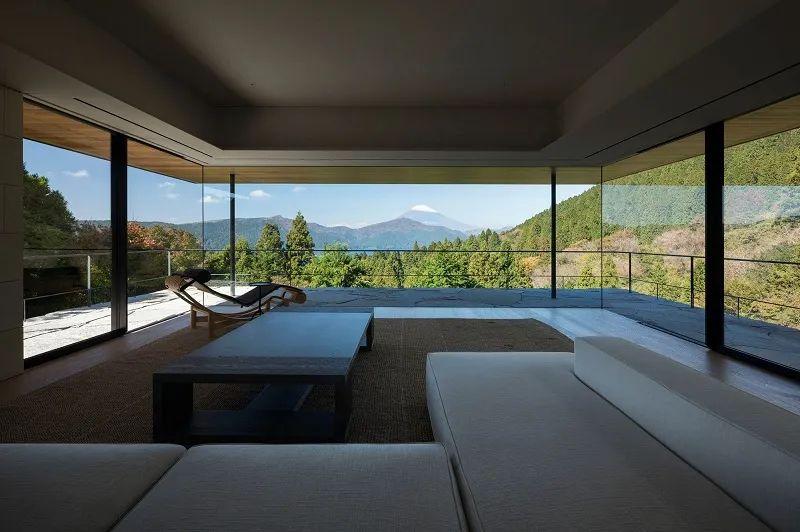 大量玻璃幕墙的运用,空间开放程度达到最大化,在室内就能远眺富士山和芦之湖,尽览箱根无限风光美景。![]()
