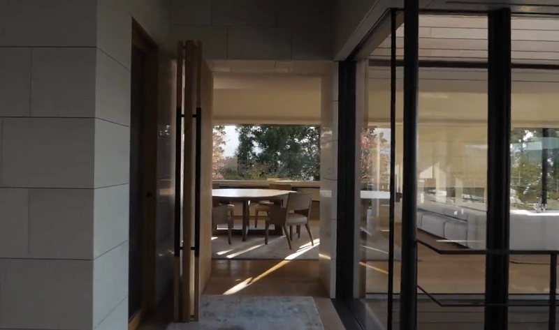 走入住宅内部,会经过户外的花园以及半户外的通庭,穿越在青石铺的路面上,路过玻璃围墙。![]()