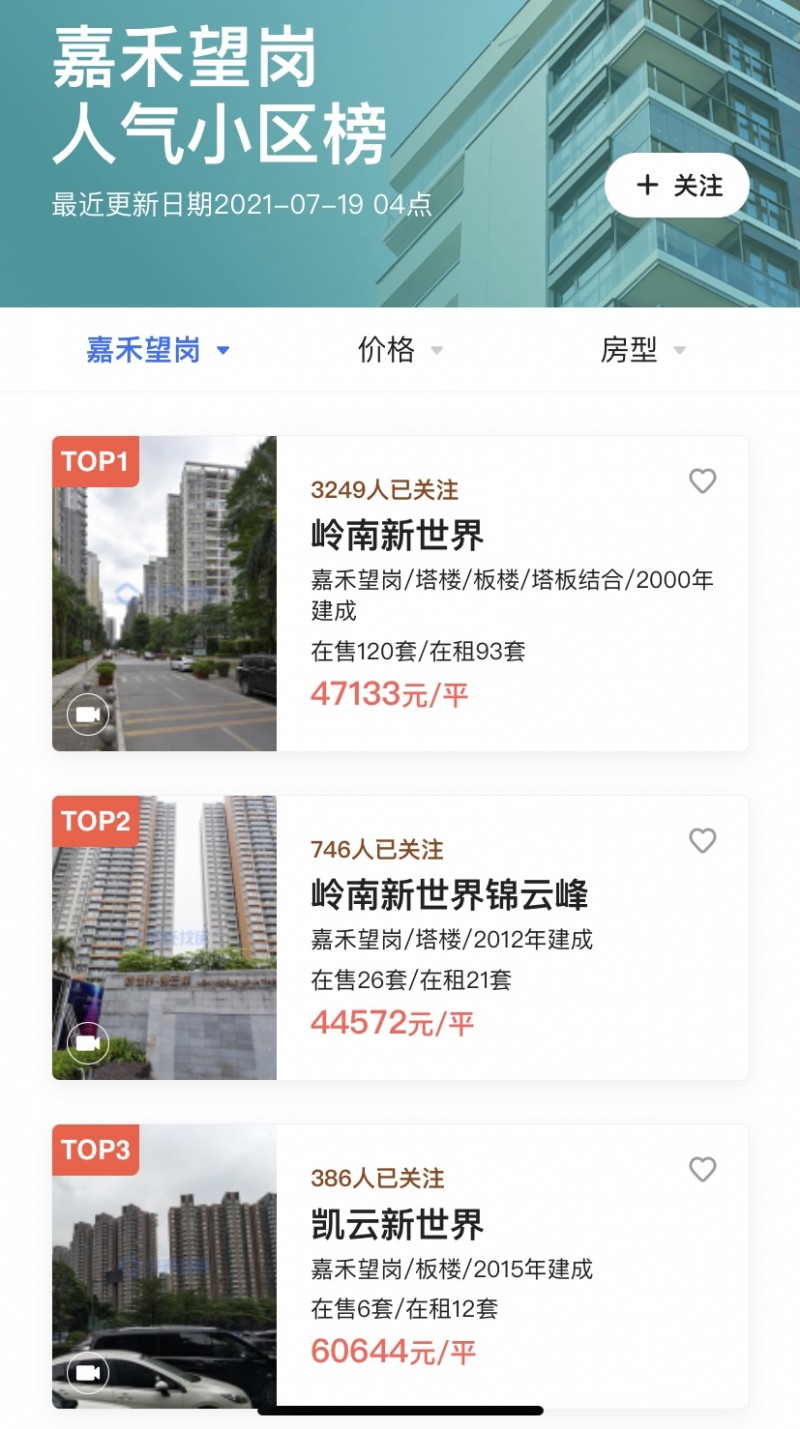 目前贝壳app二手房源上,嘉禾望岗板块关注度最高的人气前top2小区分别是: