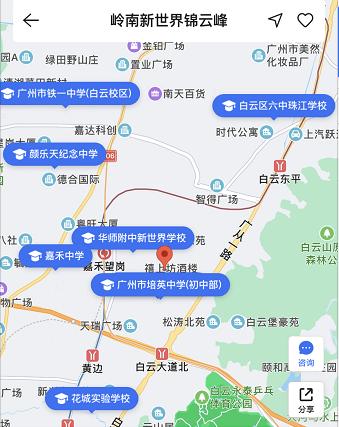半径1公里内包含:华师附中实验幼儿园、华师附中第二实验幼儿园、华师附中第三幼儿园、华师附中实验小学、华师附中实验小学第二小学、华师附中实验小学南校区、华师附中新世界学校、广州培英中学、嘉禾中学等。