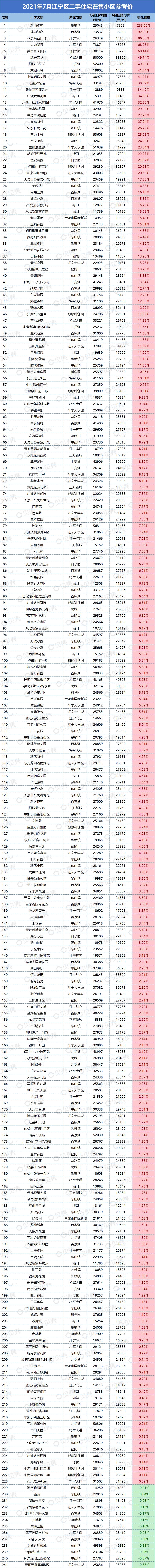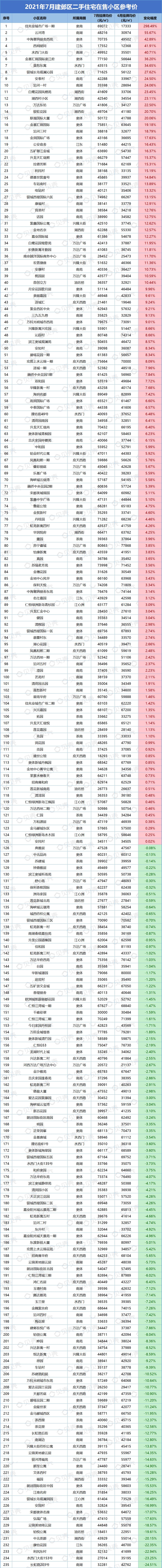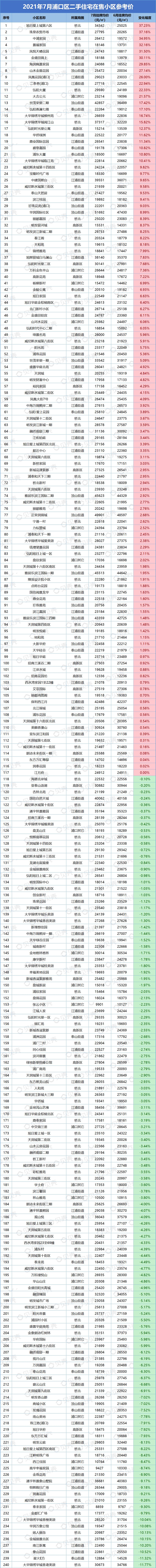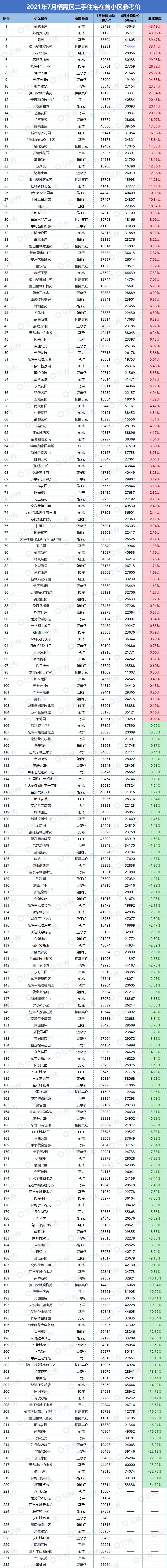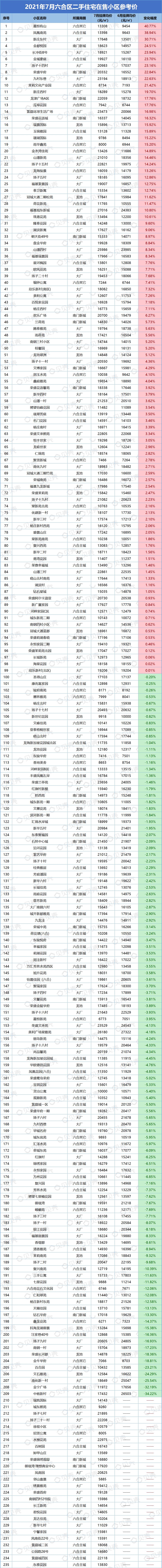 本次统计挂牌价格时间为2021年7月31日,对比日期为2021年6月30日。部分小区可能会因为挂牌房源偏少,挂牌房源价格波动大而影响小区整体挂牌均价,单位为元/平方米。因市场、时间、政策等都存在变化,内容仅供参考,不做交易依据使用。