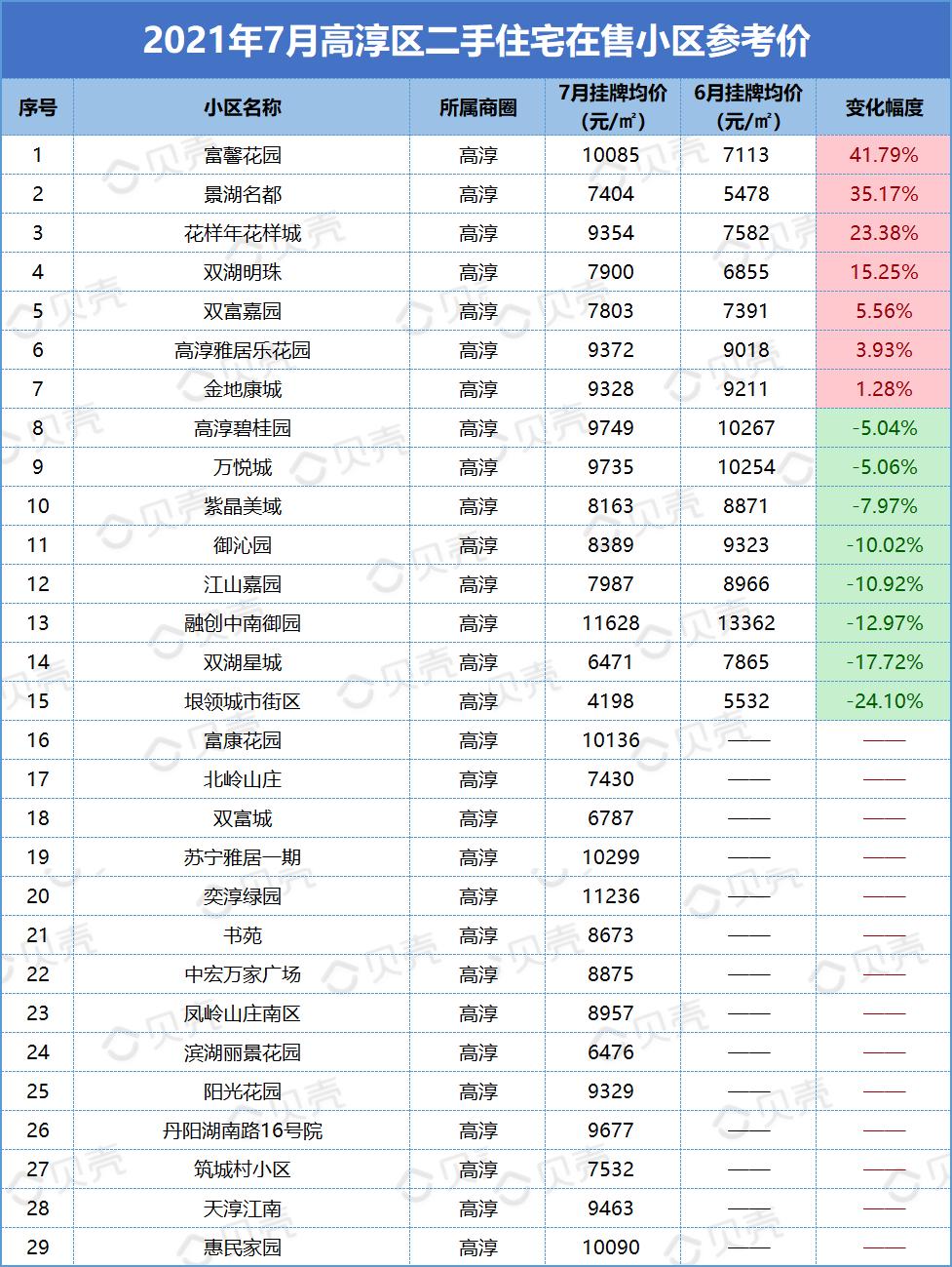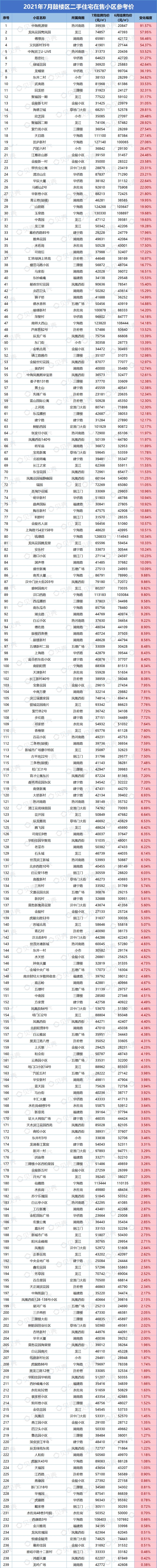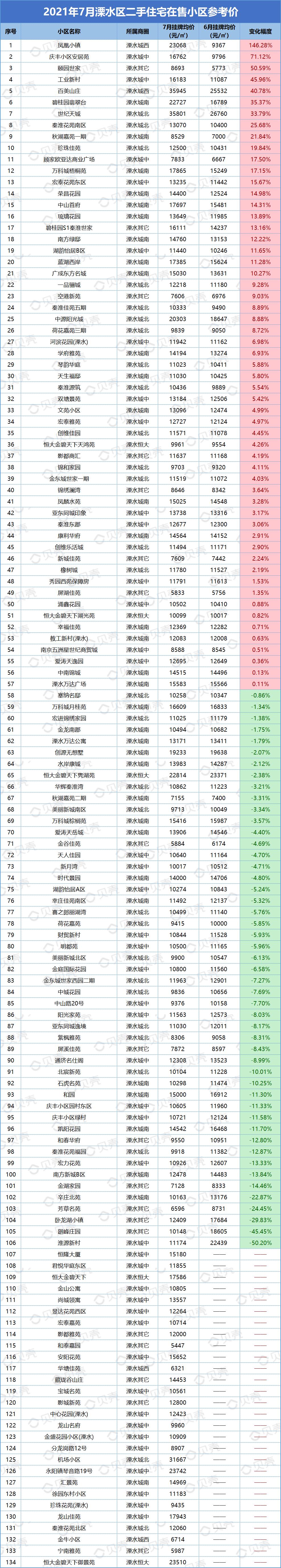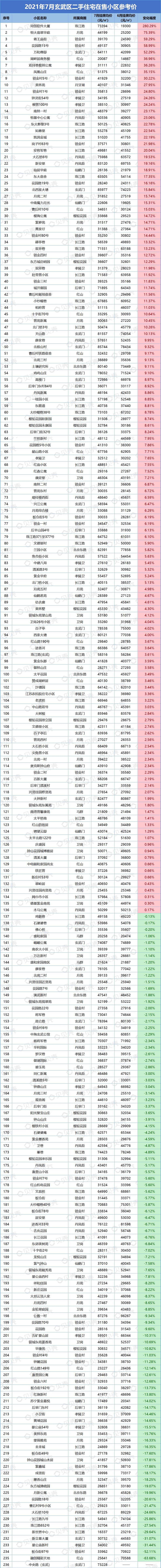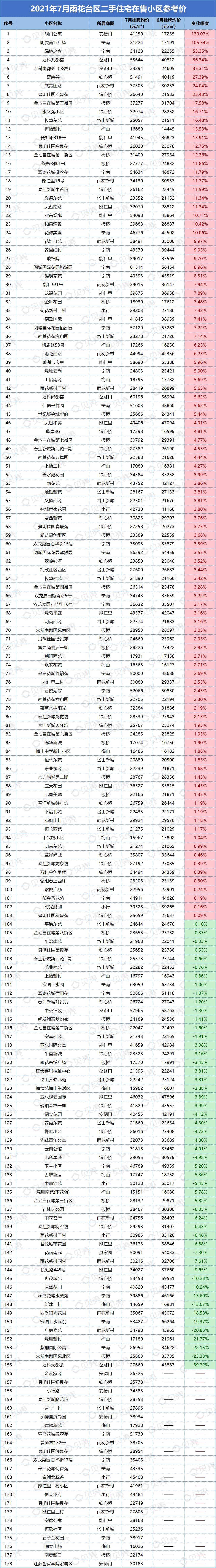 本次统计挂牌价格时间为2021年7月31日,对比日期为2021年6月30日。部分小区可能会因为挂牌房源偏少,挂牌房源价格波动大而影响小区整体挂牌均价,单位为元/平方米。因市场、时间、政策等都存在变化,内容仅供参考,不做交易依据使用。