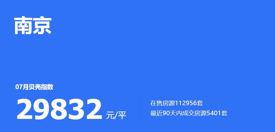 据贝壳大数据统计,2021年7月,南京二手房贝壳指数为29832元/平方米,出现小幅上涨;在售房源量112956套,基本保持平稳;最近90天内成交房源5401套,相比6月降幅明显。