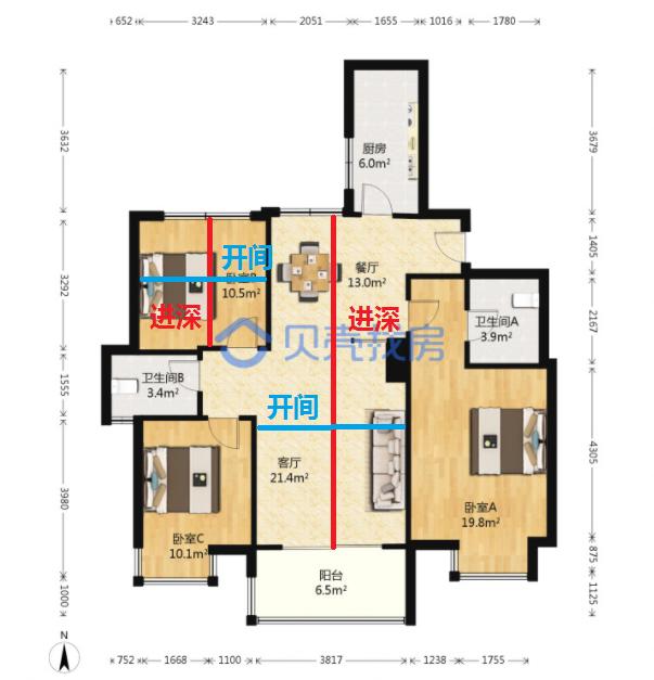 开间、进深对户型好坏的影响很大,一般来说,房间的主采光面为开间(面宽),与其垂直的为进深。如图所示,蓝色代表开间,红色代表进深。