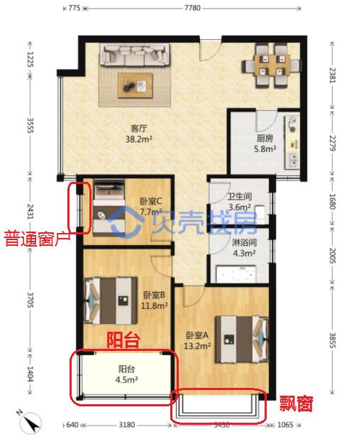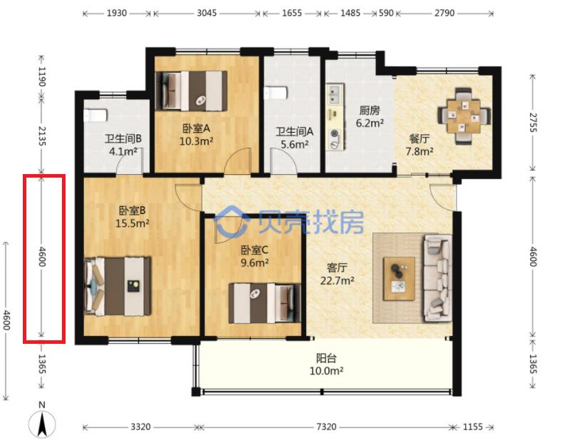 户型图中尺寸是按毫米计算,如图中的尺寸4600实际就是指4.6米。需要注意的是,户型图的尺寸一般是包含墙体的建筑面积,不是室内面积尺寸。