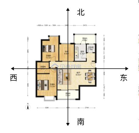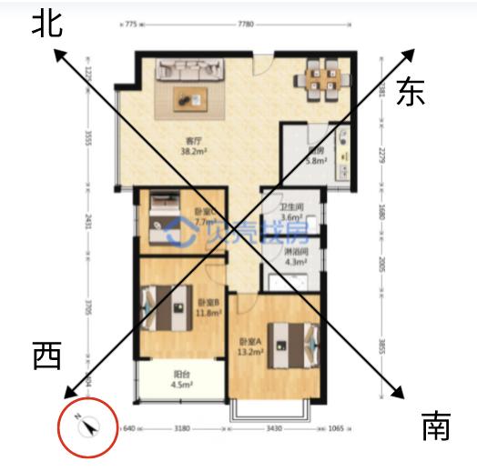 一般情况下,户型图默认方向“上北下南左西右东”,如下图所示: