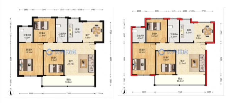 一般来说承重墙的颜色比普通墙更深,或者加粗表示,如下图红色标注即为承重墙,黑色不标注区域为非承重墙。