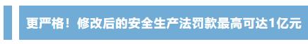 此次《生产安全法》的修改决定共42条,大约占原来条款的1/3,并且普遍提高了对违法行为的罚款数额,由现行法规定的20万元至2000万元,提高至30万元至1亿元;对单位主要负责人的事故罚款数额由年收入的30%至80%,提高至40%至100%。