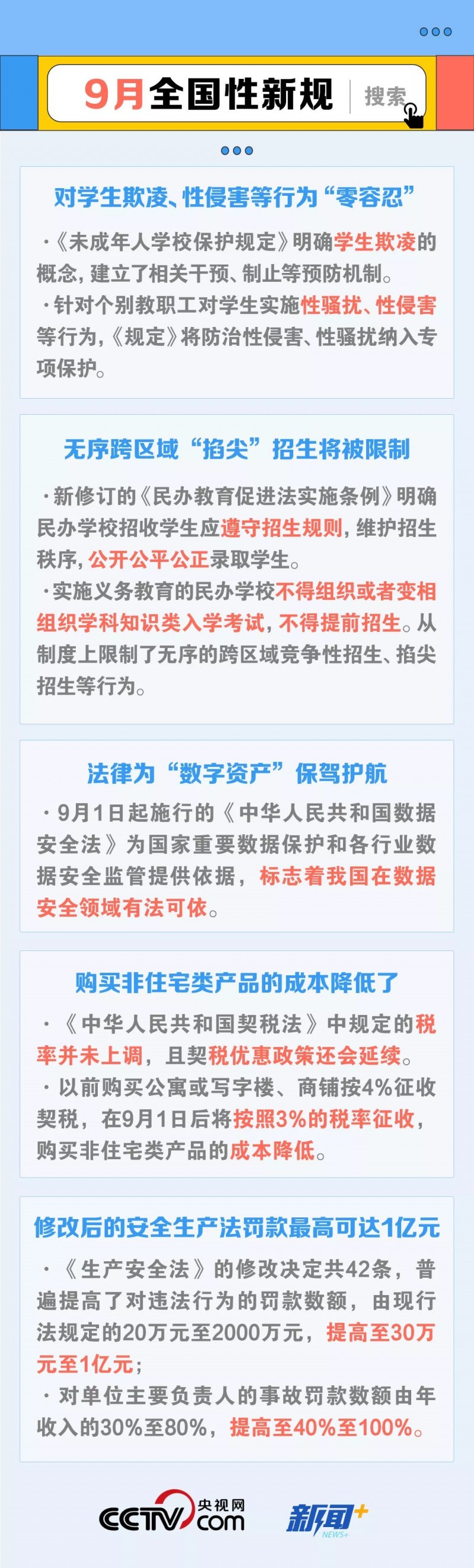 更全面、更安全、更严格、更优惠……从数字安全、生产安全到教育、购房,九月起,一批新规将正式实施,影响人们的生活。