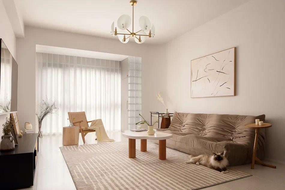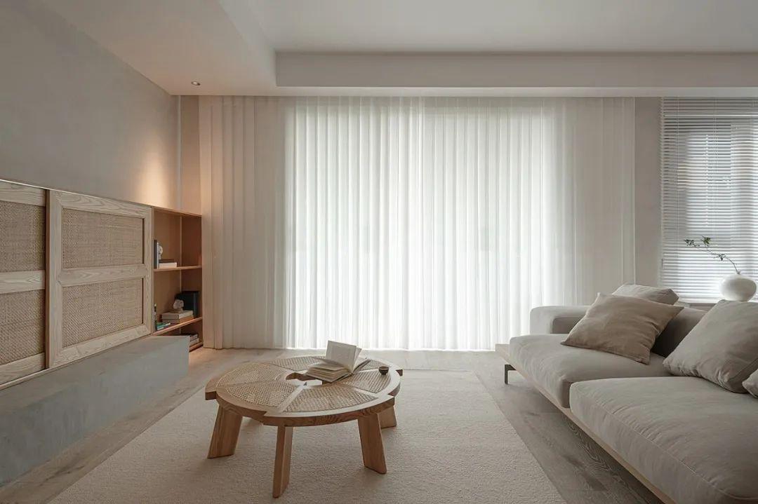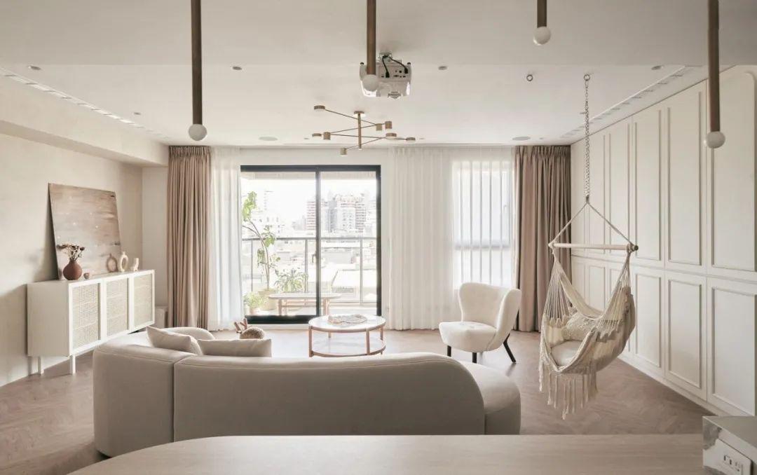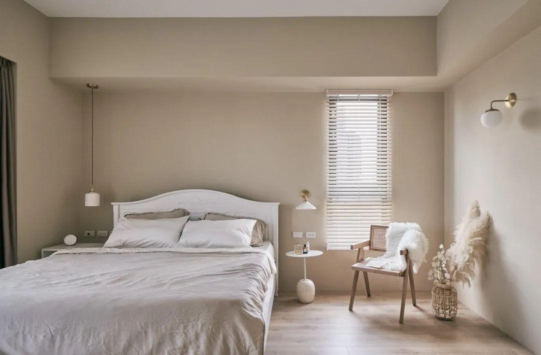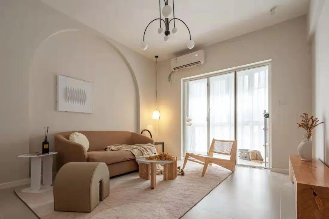 ② 奶油色+原木色+米白色+奶茶色,最后搭配白色纱帘,整体氛围温柔舒适。