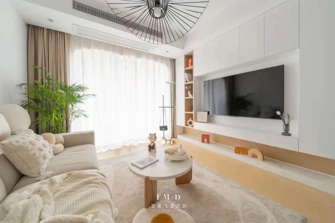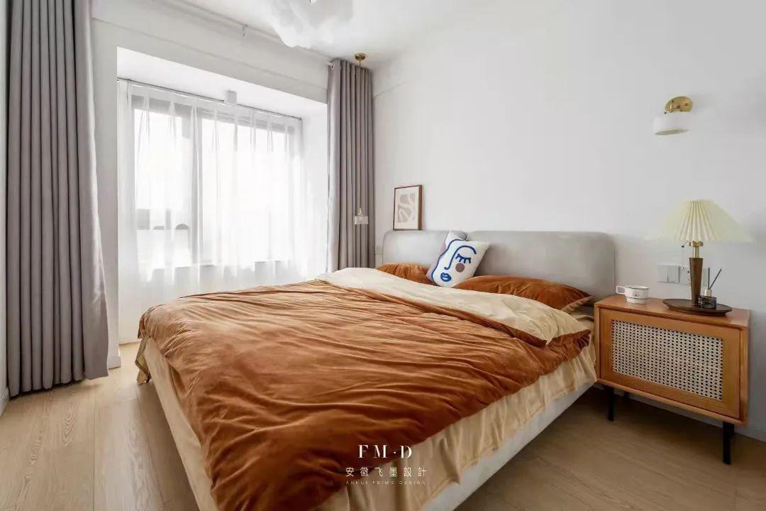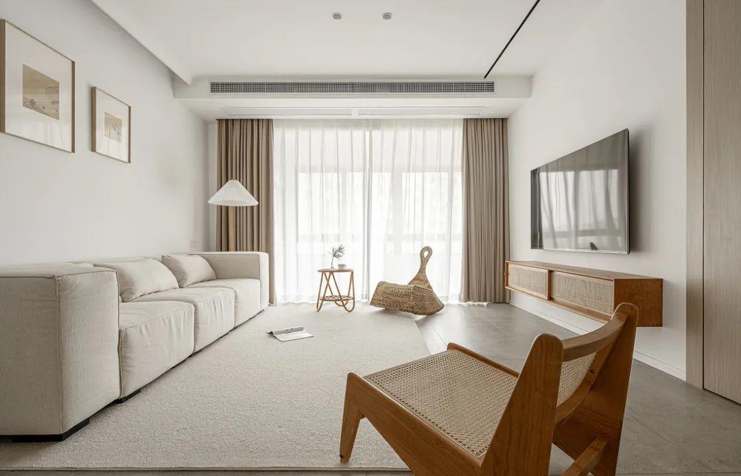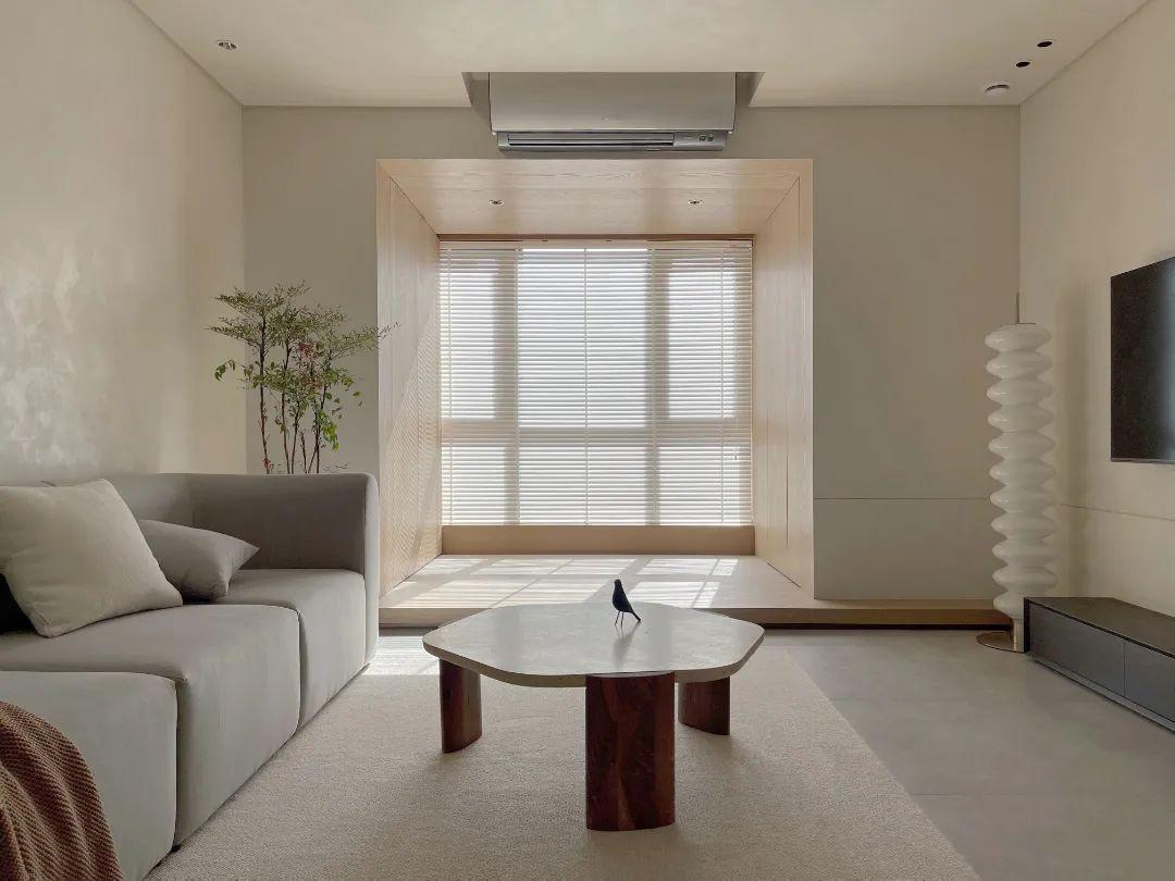 ② 奶油色+原木色+米白色+奶茶色,最后搭配白色纱帘,整体氛围温柔舒适。