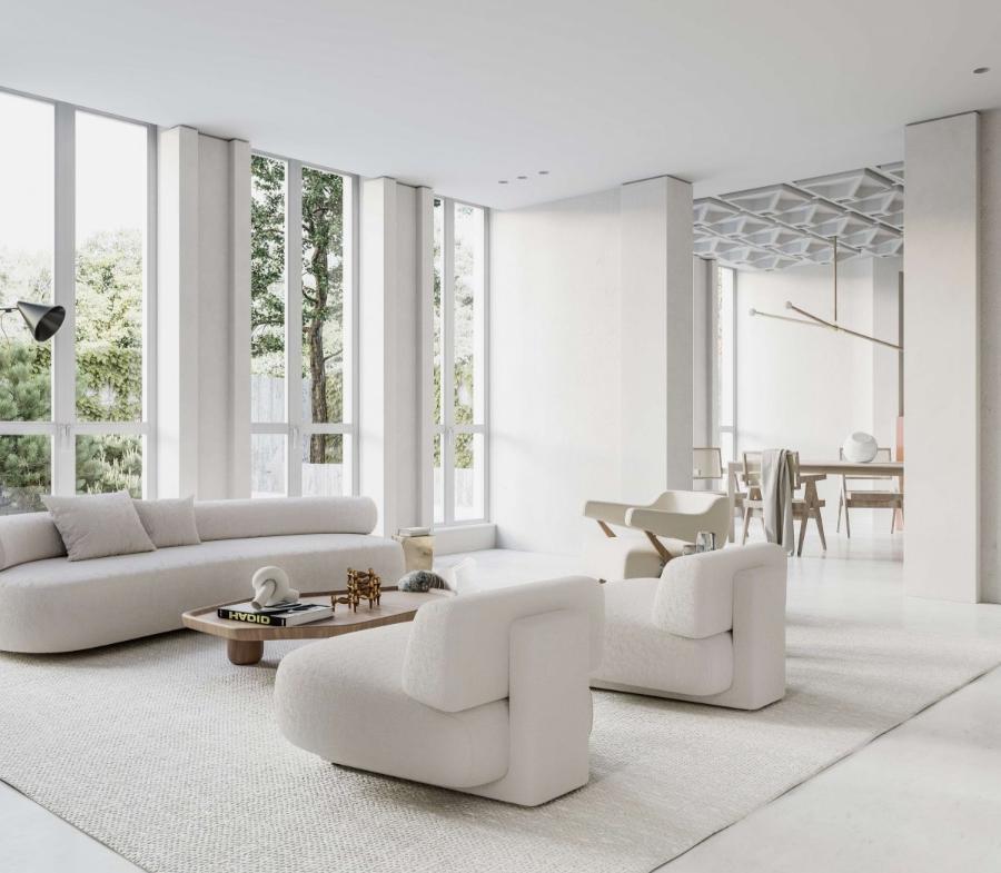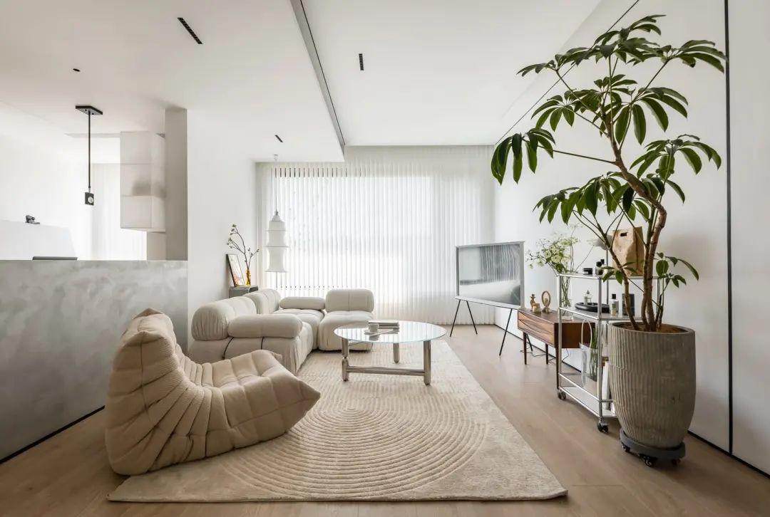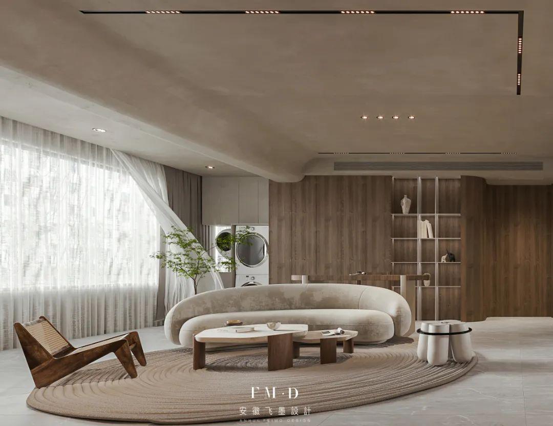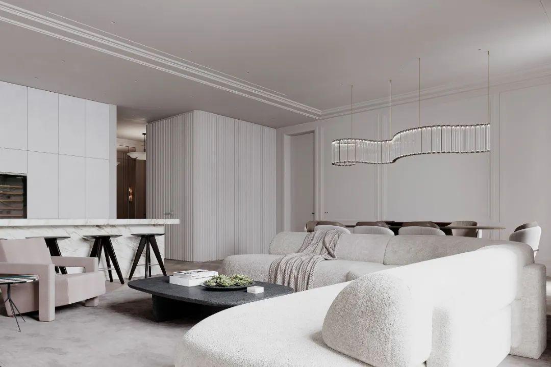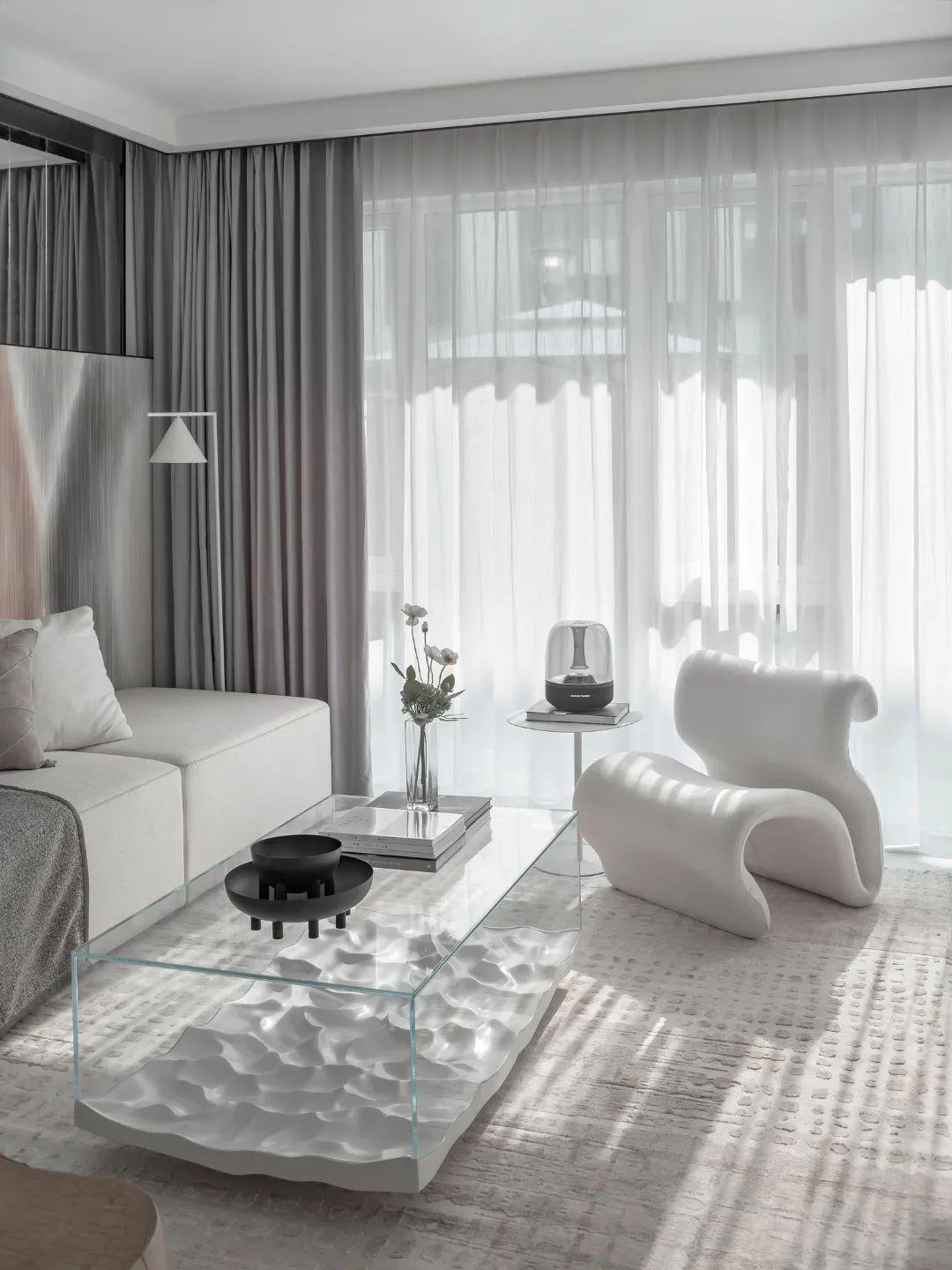 造型方面选择带有曲线的家具,例如沙发、茶几、灯具等,设计感强也能弱化空间的尖锐感。