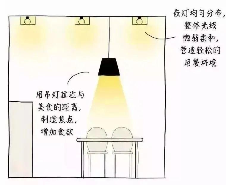 【餐厅】:利用筒灯营造氛围,吊灯作为重点照明。????