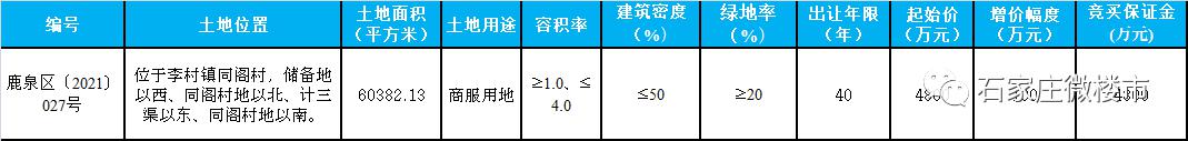 鹿泉区〔2021〕027号,位于李村镇同阁村,储备地以西、同阁村地以北、计三渠以东、同阁村地以南,占地面积为60382.13平方米(约合90.57亩),土地用途为商服用地,容积率≥1.0、≤4.0,出让年限为40年,起始价为4800万元。