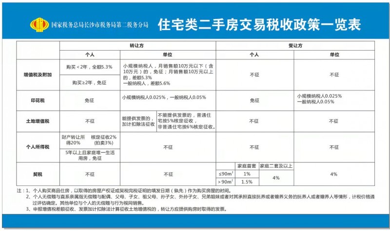 2021年11月,长沙市不动产登记中心官网公示了最新的税费政策,涉及住宅类二手房交易税收,什么情况下不征和免征一目了然。