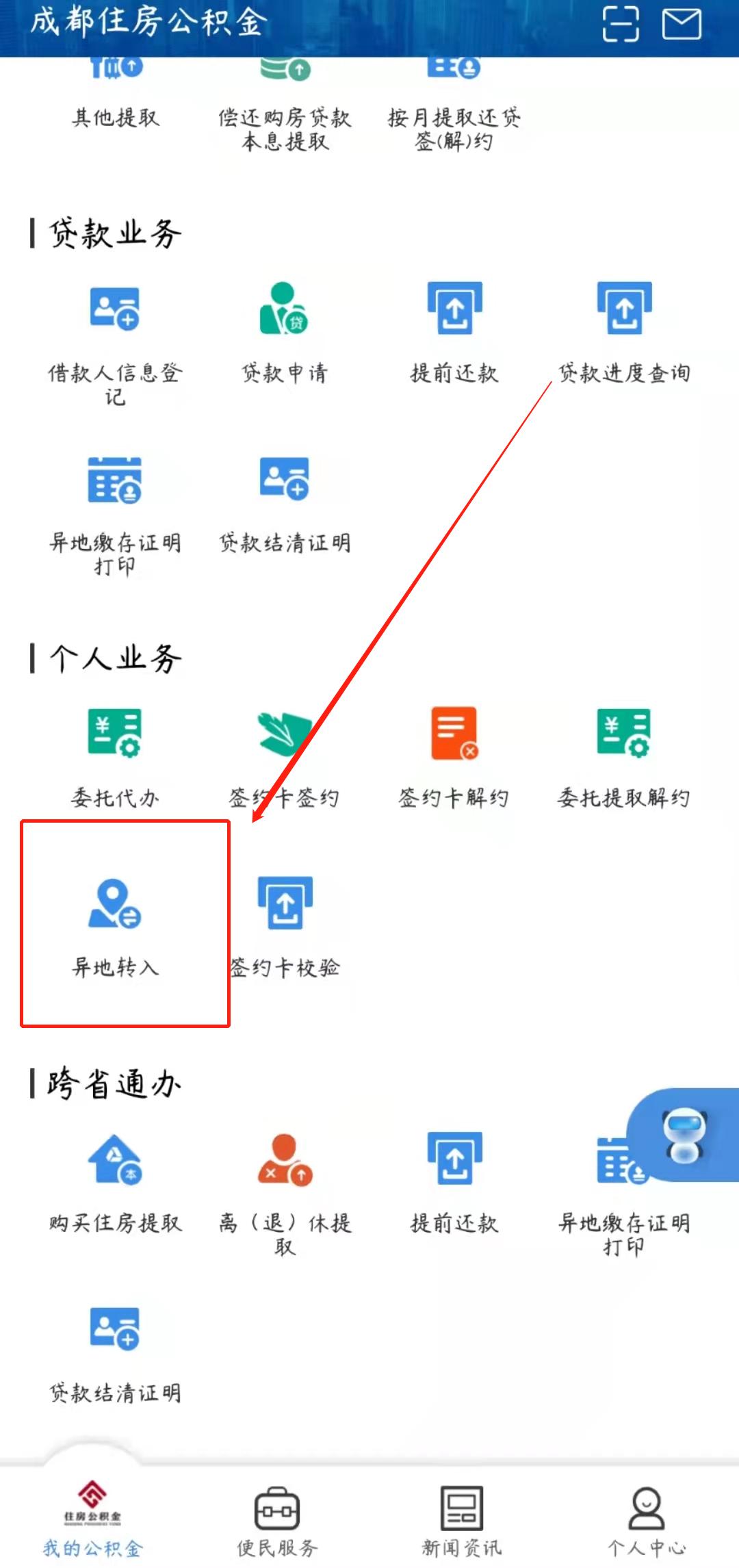 异地转入:在成都公积金app首页选择“异地转入”按流程办理即可。