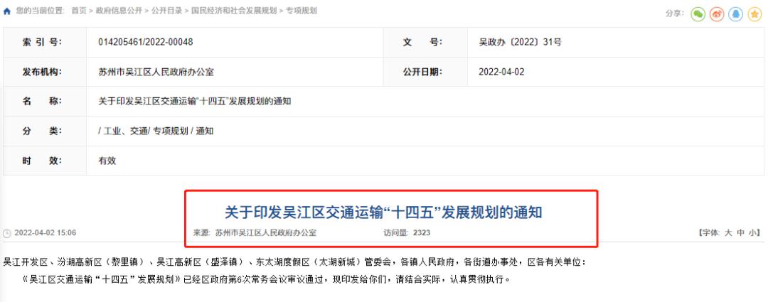 近日,吴江人民政府官网发布了《关于印发吴江区交通运输“十四五”发展规划的通知》。