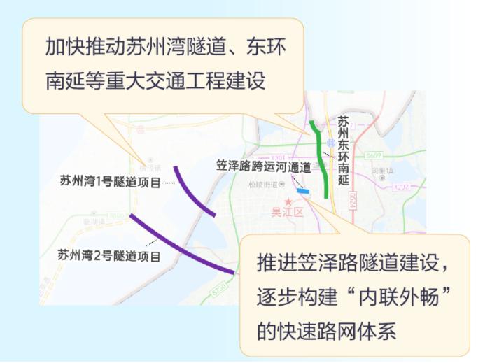 为强化区域内部节点畅联,加快推动苏州湾隧道(1号和2号)、东环南延(至东太湖大道)等重大交通工程建设,推进笠泽路隧道建设。