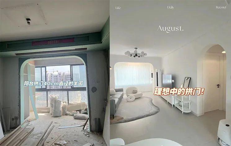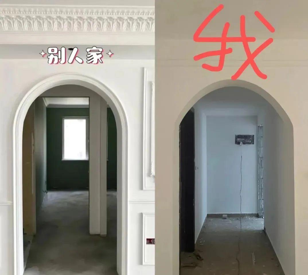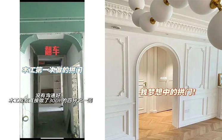 先不说弧形家具有多难订购,光是硬装阶段把部分门洞、垭口、吊顶做成圆角墙,施工难度就已经不小,翻车情况也比比皆是: