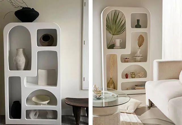 听起来不就是选选颜色的事儿吗?然而,同样的柜子,搭配冷色陈列是冷静的侘寂风,搭配暖色陈列就成了奶油风:
