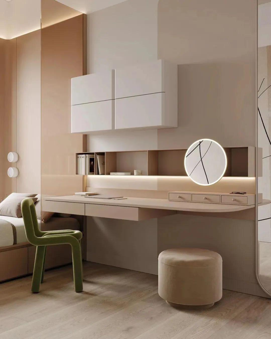 ③考虑增加层次感,同一面墙也可以用两种不同的浅色系搭配,如白色和奶咖色同时使用,可划分色块设计。