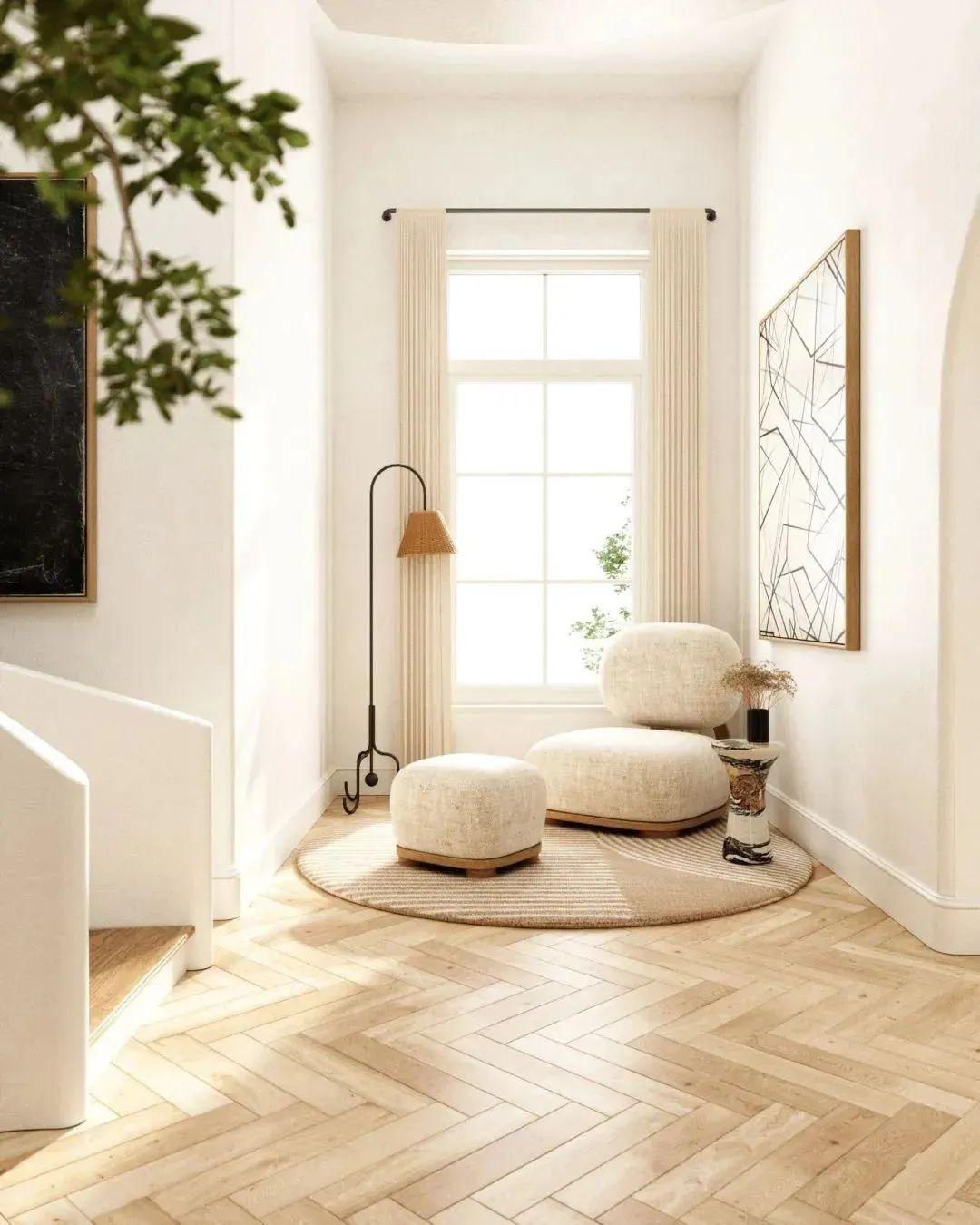 1、弱化轮廓:墙面顶面棱角处可作出弧度造型,柔化空间轮廓,从硬装到软装整体给人浑然天成的柔和感。