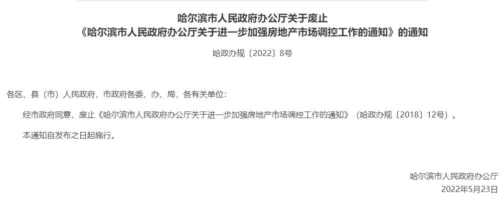 注:稿源:哈尔滨市人民政府官网《重磅!哈尔滨宣布废止《关于进一步加强房地产市场调控工作的通知》