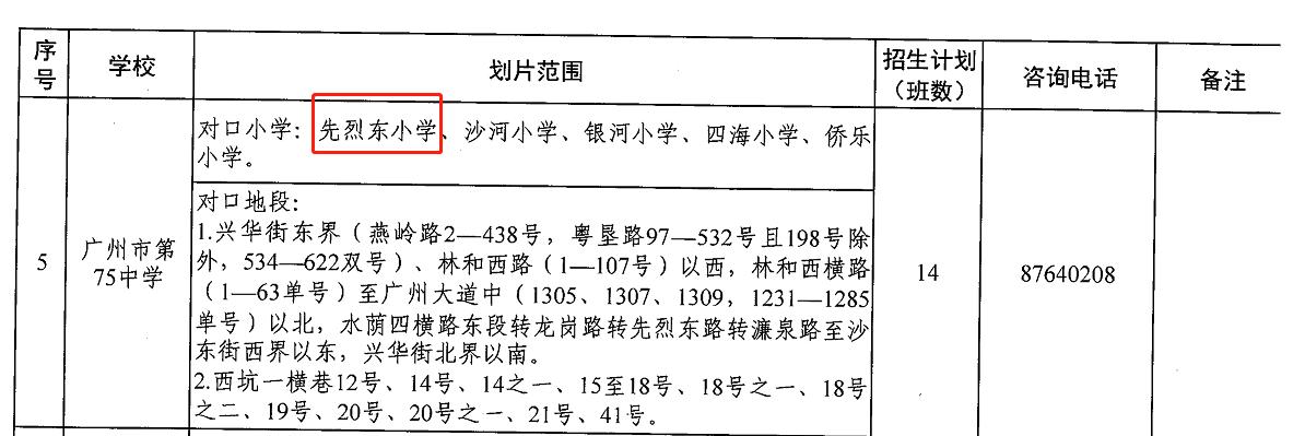 根据2022年政策,先烈东小学对口直升学校为广州75中学。