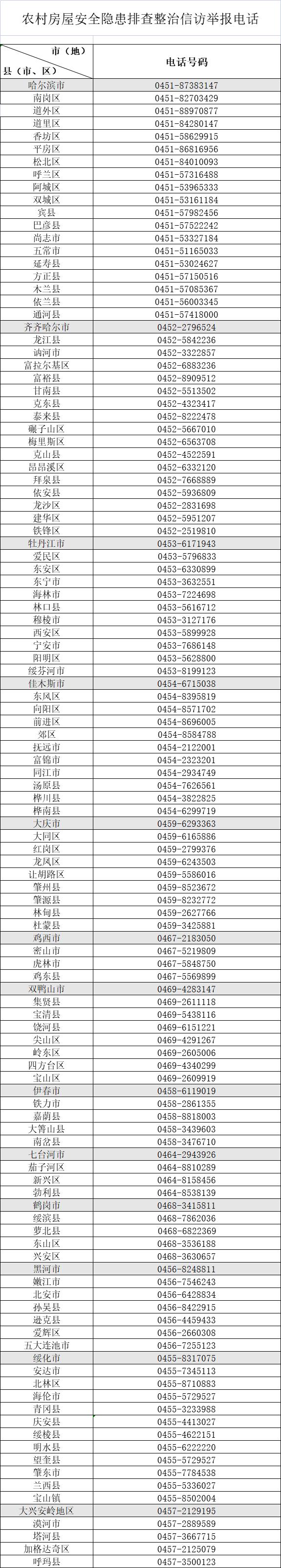 为加强城乡既有房屋安全隐患排查整治工作,近日,省住建厅将全省各市(地)、县(市、区)城乡房屋安全隐患问题举报电话予以公布,接受社会监督和投诉。