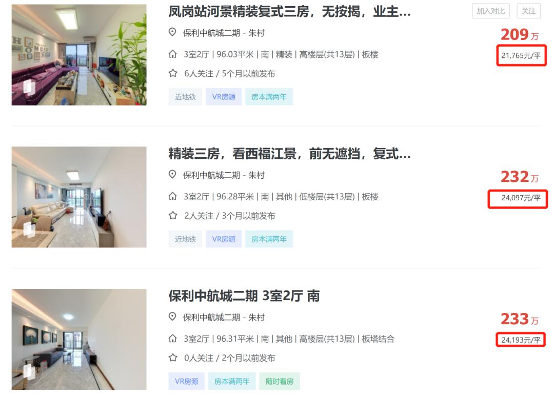 目前,链家上保利中航城二期同等户型的挂牌价在2.1-2.4万/平左右。中介表示,保利中航城一期的成交房源较多,成交价在1.8万/平左右。
