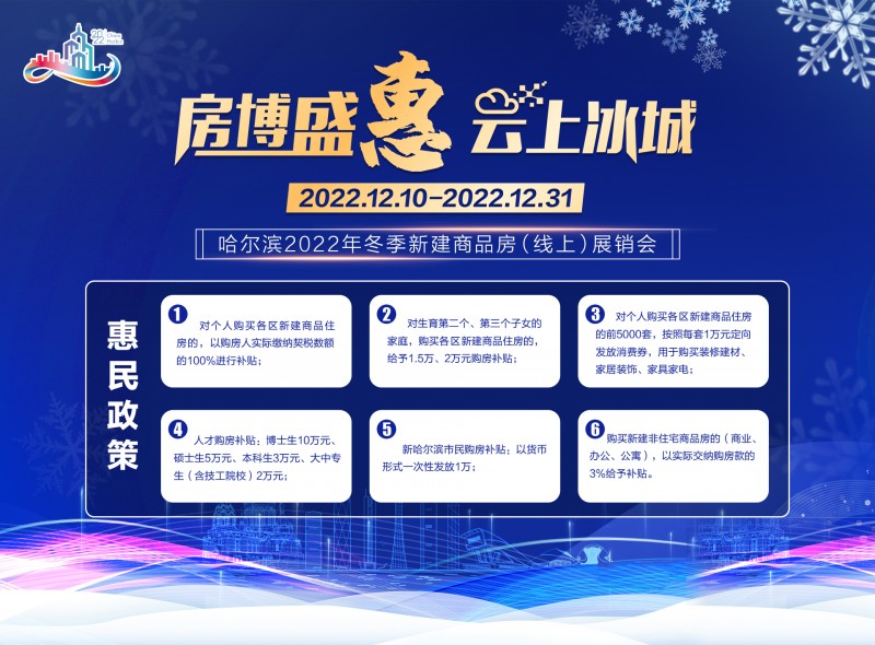 “房博盛惠 云上冰城”——哈尔滨市2022年冬季新建商品房(线上)展销会于12月10日至12月31日在“悦居网”举办。房展会期间购买新建商品房将推出契税补贴、非住宅补贴、人才补贴、新市民补贴、二孩三孩补贴、发放大额消费券等重磅惠民政策。