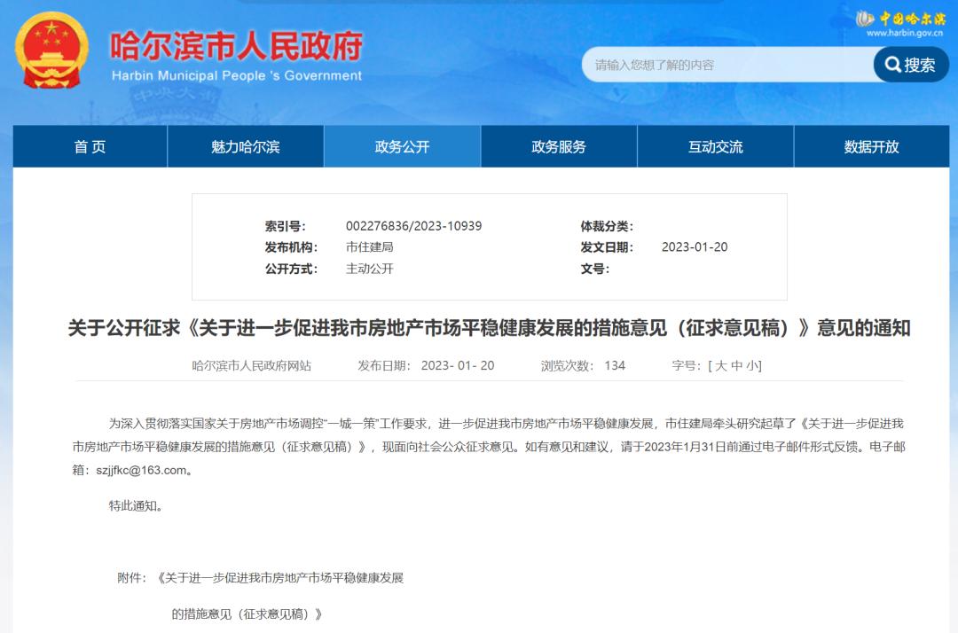 1月20日,哈尔滨市人民政府网站发布《关于进一步促进我市房地产市场平稳健康发展的措施意见(征求意见稿)》,文件指出,具有哈市户籍(包括9区9县(市)),符合生育政策,在2021年10月29日以后生育第二、第三胎的家庭在主城9区内购买首套或第二套新建商品住房,凭网签备案《商品房买卖合同》、本人身份证明、购房交款票据、《不动产权证书》、户口簿和出生医学证明等,分别给予1.5万元、2万元的一次性购房补贴,补贴资金由市级财政承担。