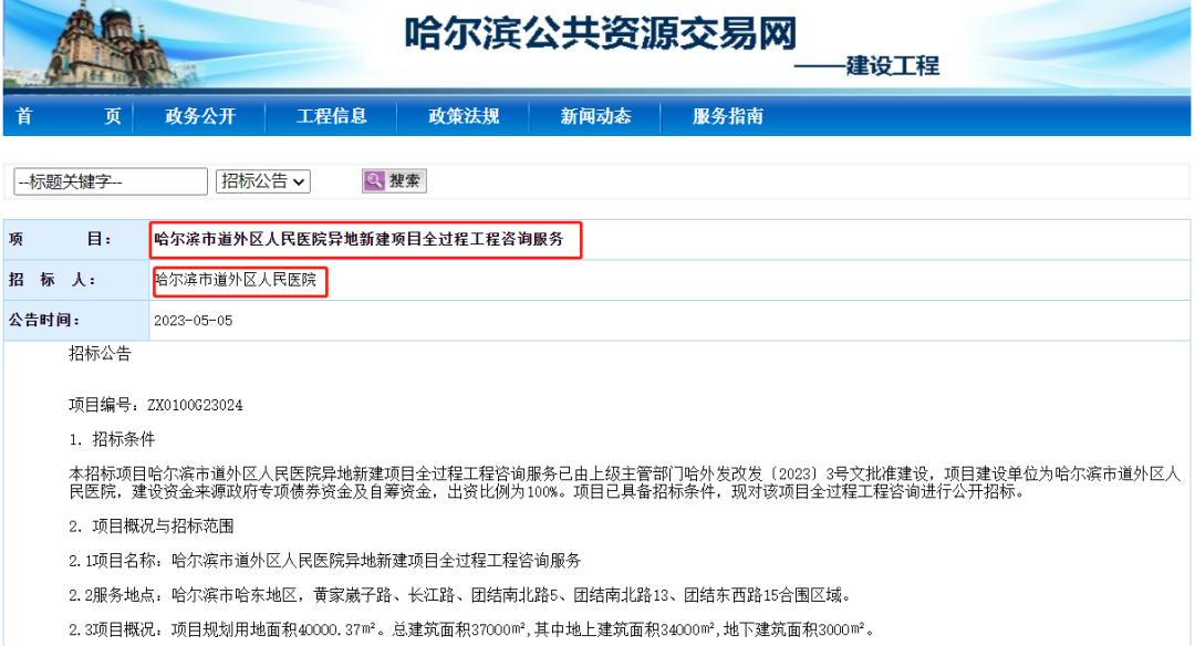 道外区人民医院异地新建项目全过程工程咨询服务已由上级主管部门准建设,现进行公开招标。