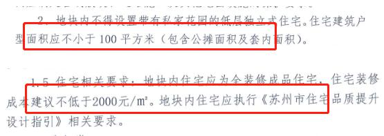 住宅户型不小于100²(包含公摊面积及套内面积);装修交付,装标不低于2000元/m²。