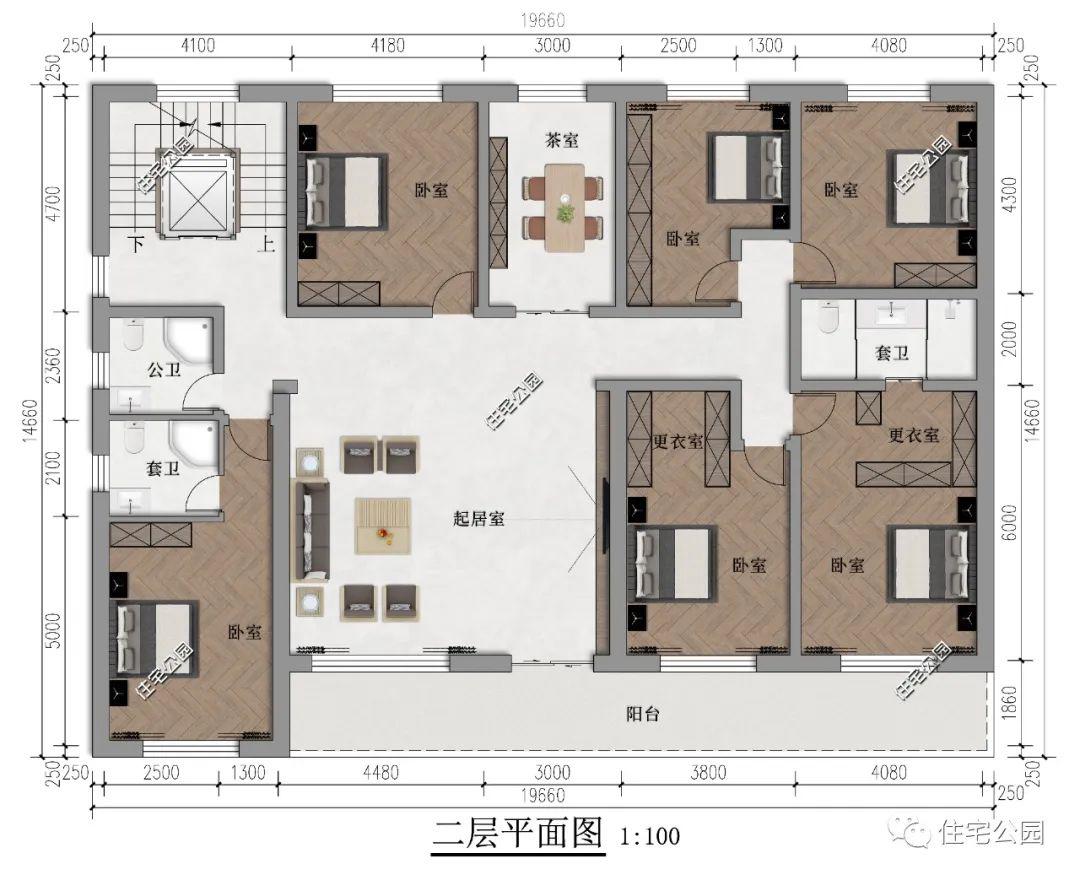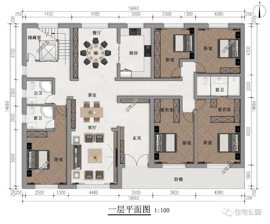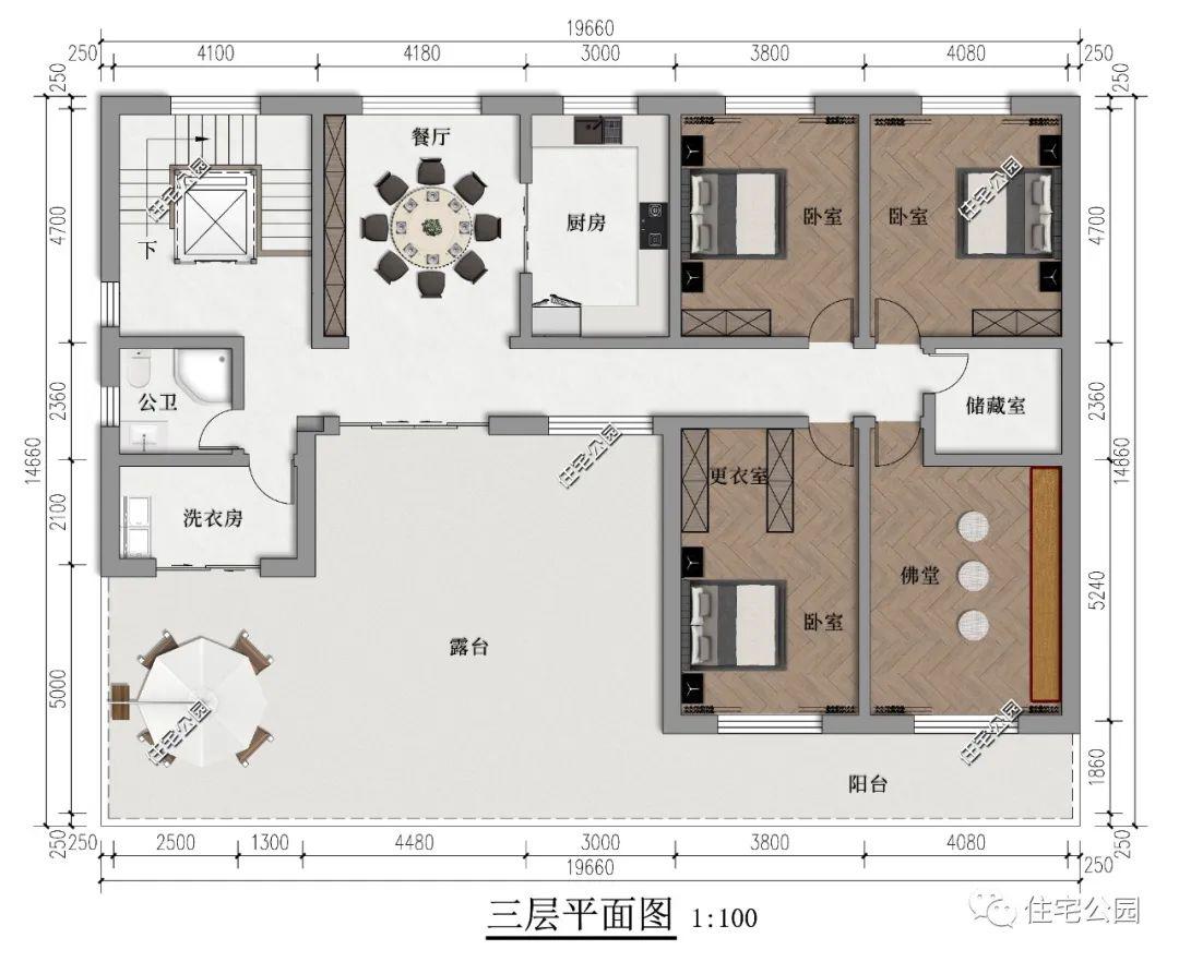 取消确定农村盖房想要质量好还想省钱那就学习住宅公园这门课简单实用避坑指南农村兄弟姊妹不想分家建双拼,还有没有别的办法可容纳一大家子居住?有!那就是分层生活,自建一栋三~四层的农村别墅,每层均为独立个体,自带厨餐空间与客厅,这样一来,不用建双拼也能满足家庭生活需求。今天的这套定制户型便是如此,它很好的协调了各个家庭成员的生活空间,一至三层各自独立,与家人紧密联系的同时,也保持了一定的距离感。遵循业主的建房想法,我们对室内又做了细节补充。设计家用电梯一座方便上下,多卧室设计满足所有人的居住需求,想了解具体信息,赶紧来看今天的户型鉴赏。户型基本信息占地尺寸:19.66m×14.66m占地面积:278㎡建筑面积:748㎡建筑结构:砖混结构建筑高度:11.64m建筑情况:14室 4厅 2厨房 2茶室 7卫 5更衣室 1佛堂 1储物间 1洗衣房 1露台 1阳台 1玄关建房试算平面布局图:一层省去了上下爬楼的麻烦,可安排父母居住在此。客厅与餐厅做大通透设计,中间无遮挡采光更优越。五间卧室提升原有旧宅居住不惬意的痛点,同时新增了更衣空间与独卫设计,更好地服务家人。二层按照业主需求暂时未设计厨餐空间,后期若是有需求,会将茶室改造成厨房使用。二层的布局与一层大致相同,卧室配置无异,值得一提的是宽敞舒适的起居空间,拥有43平的面积,搭配南向落地窗给予室内更舒适的光照。三层在原有布局的基础上,取消了起居空间,改为惬意自在的大露台,可以根据自身需求改造成休闲娱乐区,满足人们沐浴阳光、感受自然的欲望。