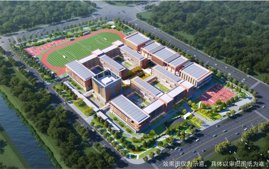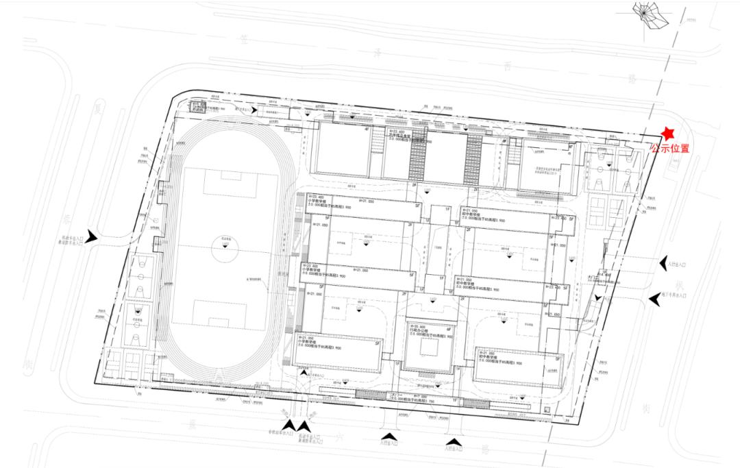 从规划公示可以看到,学校设有多个运动场所和初中、小学教学楼