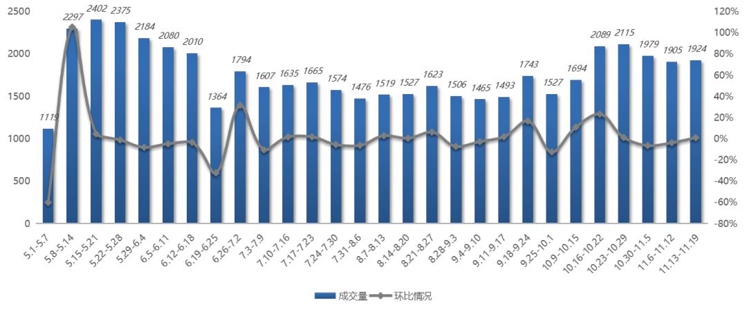 因上市量减少影响,南京二手房新房认购、成交量均处于低位。目前市场挂牌行情仍相对低迷,新增挂牌房源量价齐跌。上周,南京全市二手房成交1924套(含高淳、溧水),环比小幅上涨1%,其中主城九区成交量1785套。从成交走势来看,11月以来,二手房成交量连续3周保持稳定,周交易量均在1900-2000套,波动较小,但近期二手成交均价有下行的趋势,市场以价换量情况加剧。2023年南京二手住宅逐周成交量及环比情况