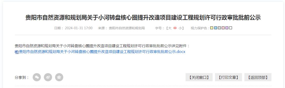 1月31日,贵阳市自然资源和规划局发布关于小河转盘核心圈提升改造项目建设工程规划许可行政审批批前公示。