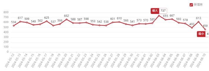 供应量方面,作为一直以来年中冲刺的月份,今年6月,二手房新增房5950,月同期环比上涨6.23%。本周(6.3-6.9)新增房4336,周环比上涨7%。单日新增最高达737套。