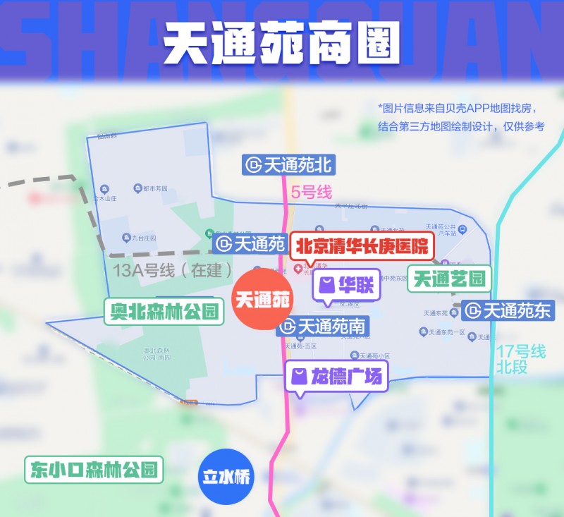 公园和医院等公共设施方面,目前商圈东边有街心花园、天通艺园、口袋公园,还靠近温榆河森林公园,也有体育馆,商圈西边是占地2104亩的奥北森林公园。
