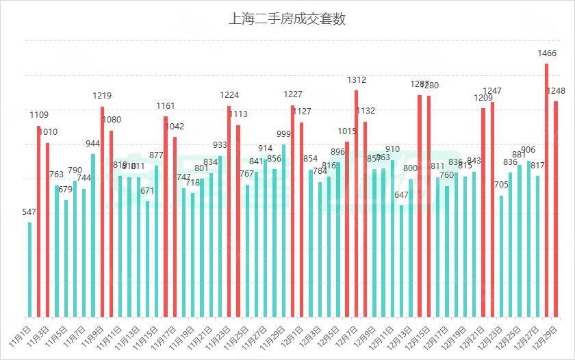 年底上海二手房热度依然不减,周末单日成交量创下年内新高。网上房地产数据显示,12月28日(周六),上海单日二手房网签成交1466套,超越10月13日的1334套,创年内二手房单日成交新纪录。12月29日(周日),网签成交量仍维持高位,成交套数1248套,周末两日共计成交套数达2714套,亦成为年内成交套数最多的一个周末。同时,根据网上房地产数据,12月的9个周末日,二手房(含商业)成交量全部破千,日均成交1256套。