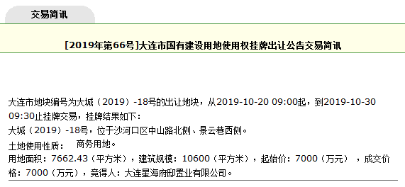 转载自大连市国有土地使用权交易中心《[2019年第66号]大连市国有建设用地使用权挂牌出让公告交易简讯》